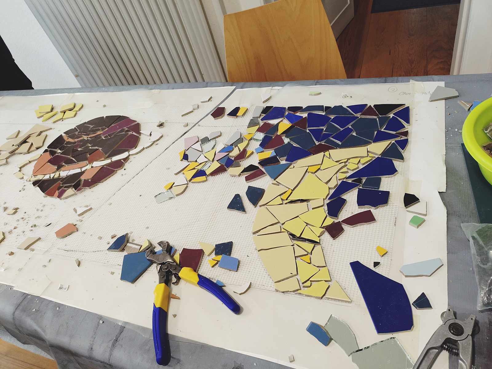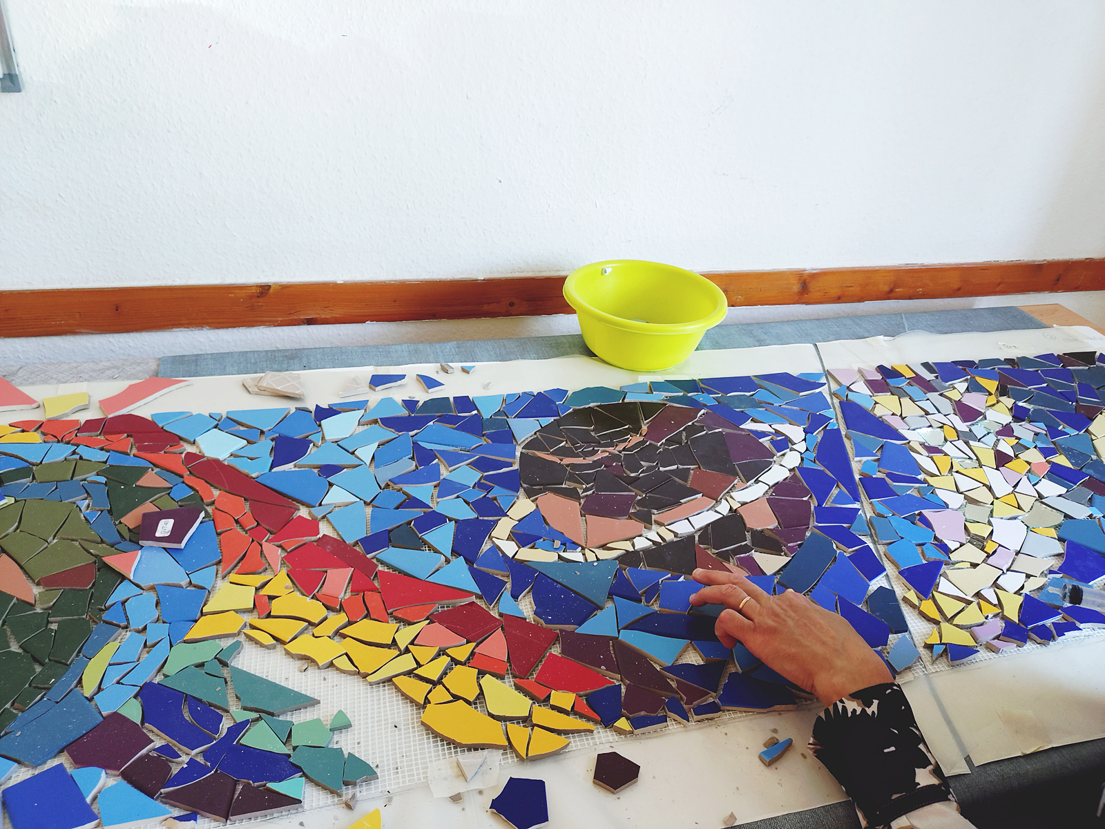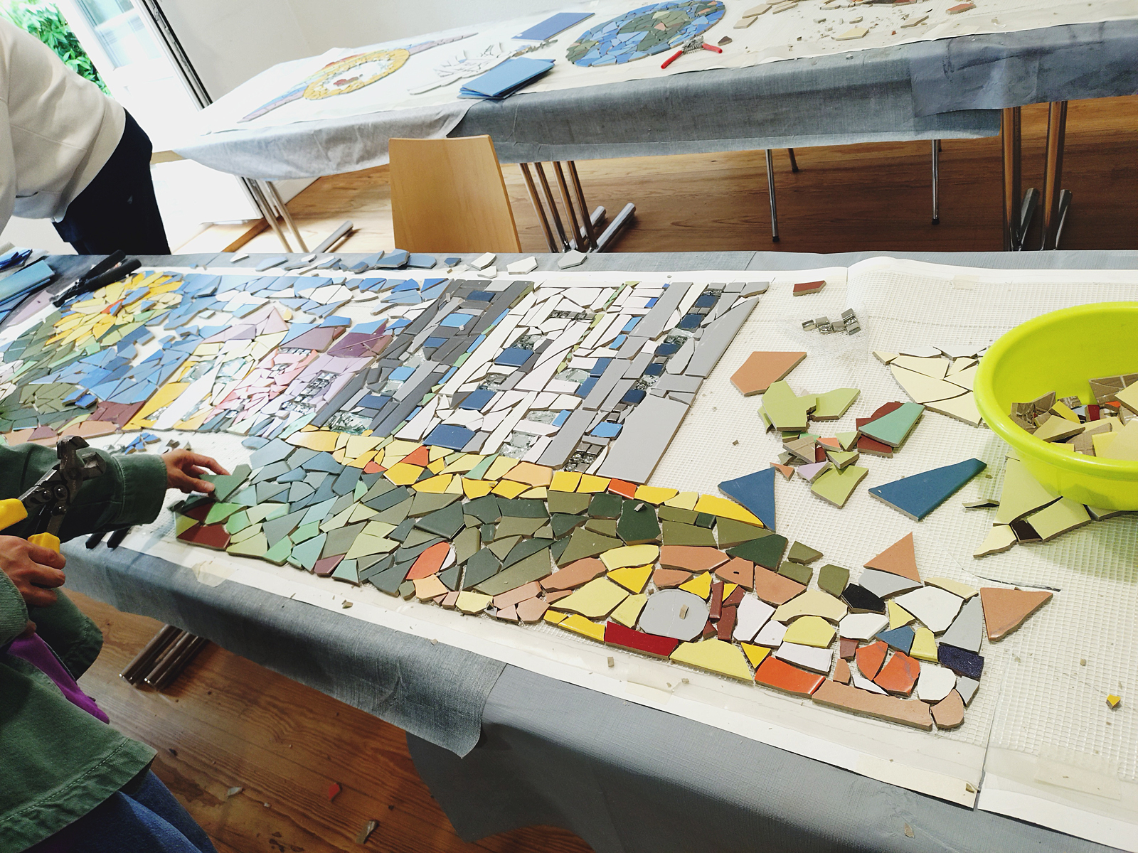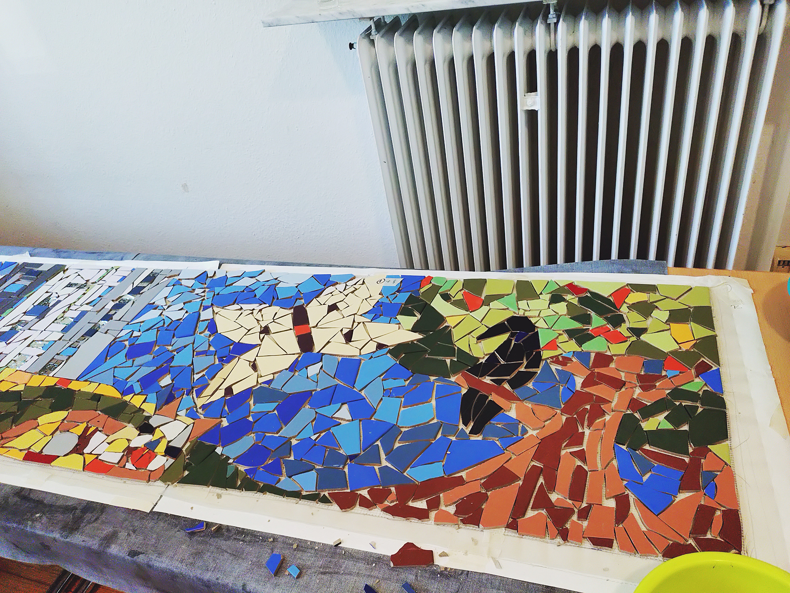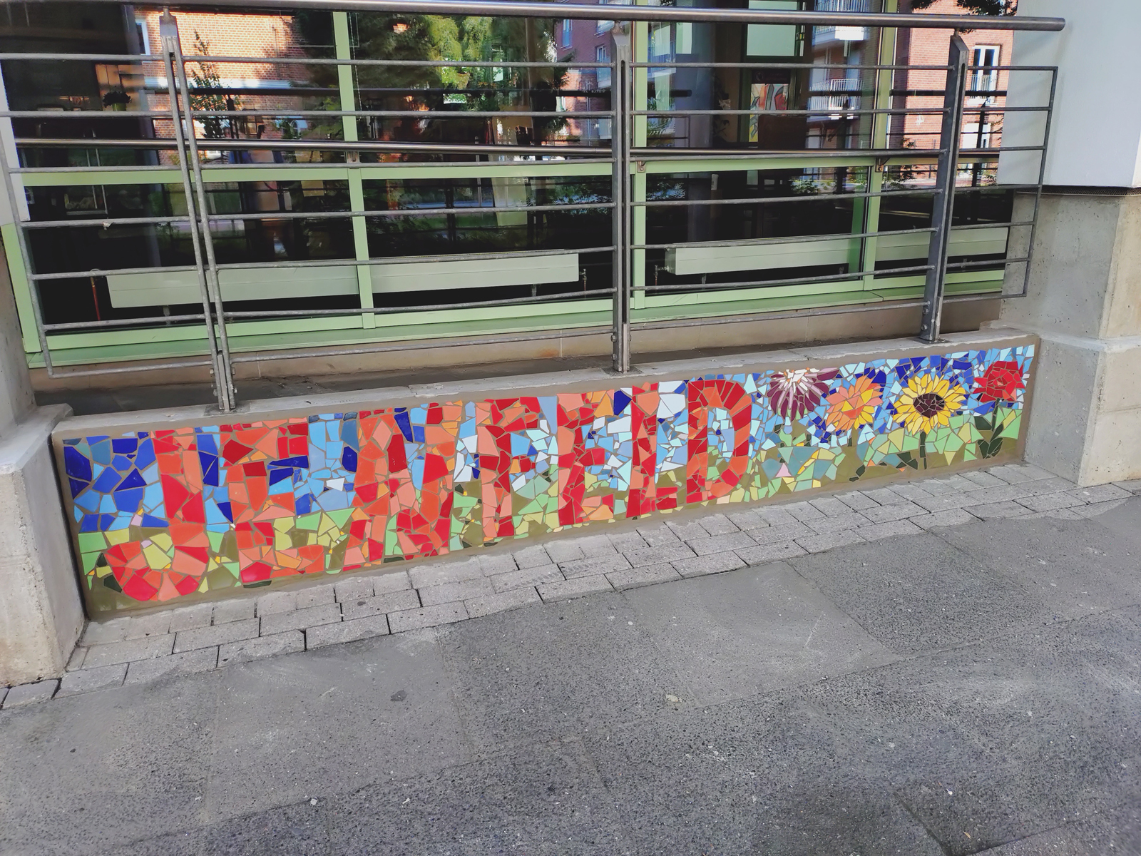 Im Rahmen der Jenfeld-Galerie startete im Juni ein öffentliches Mosaikprojekt mit Bürgerbeteiligung im Stadtteil Jenfeld. Gestaltet wurde ein 12 Meter langer Betonsockel am Haus. Für die einzelnen Stücke von jeweils. ca 3 x 0,6 m entstanden erstmal Ideen, die auf Papier skizziert wurden. Vielfalt und Frieden waren Begriffe, die genannt wurden, aber auch der Stadtteil an sich sollte dargestellt werden. Jenfeld hat seinen Namen vom "gelben Feld" (gelbe Erde). Den Stadtteil an sich prägen Hochhausbauten sowie Einfamilienhäuser und viel Grün. "Im Jenfeld gibt es ganz viele Raben", erzählte eine Teilnehmerin, eine Katze wünschte sich eine andere. Aus diesen "Bildern" galt es nun ein Gesamtkonzept zu erarbeiten.