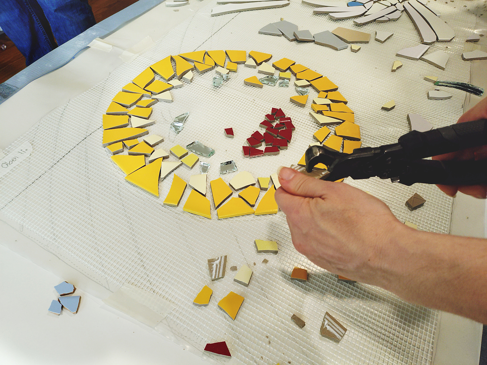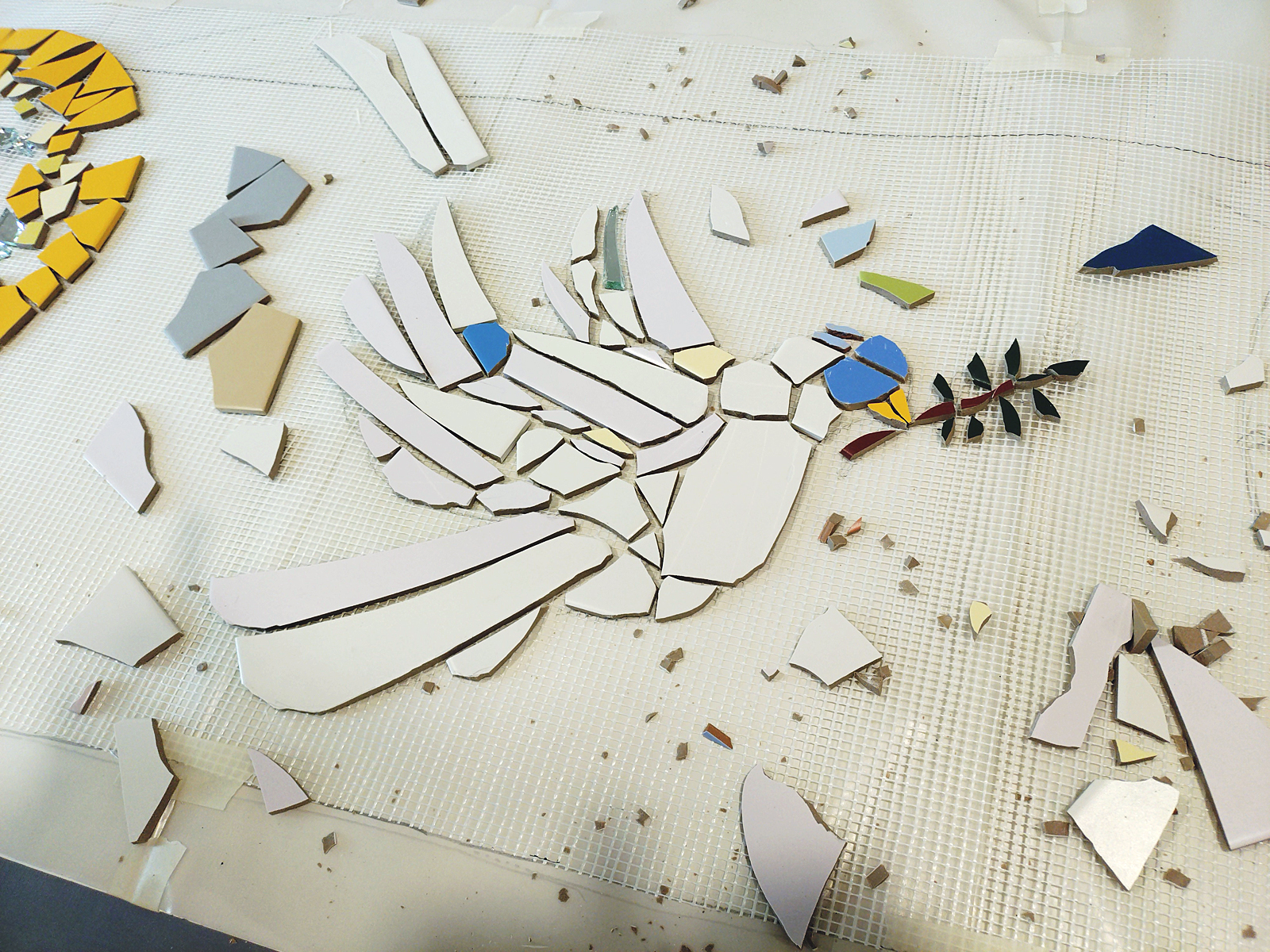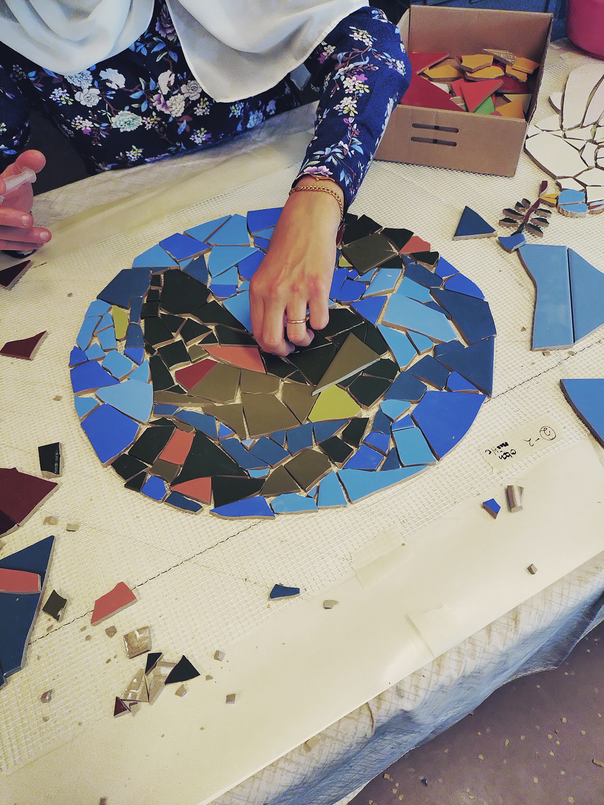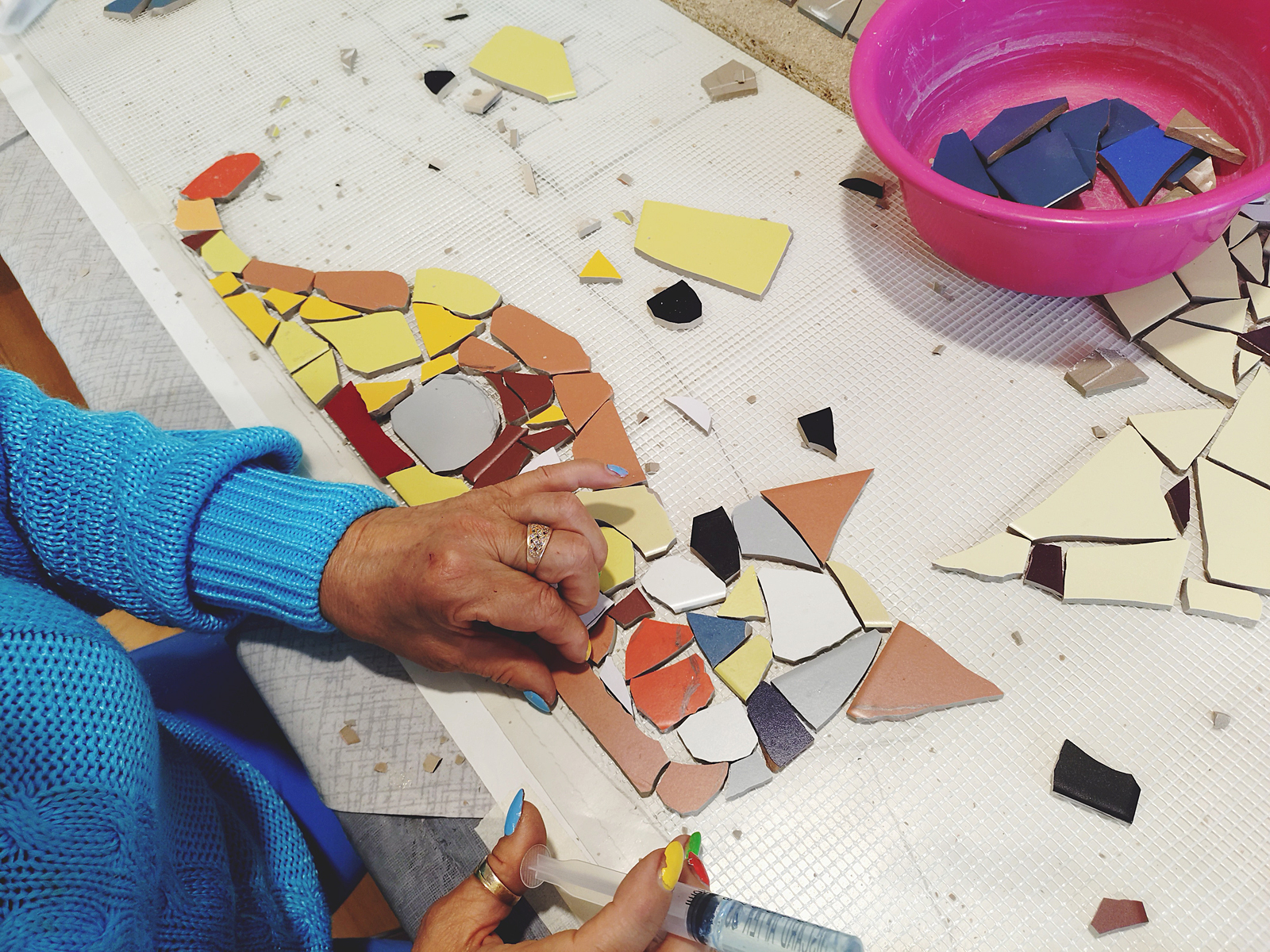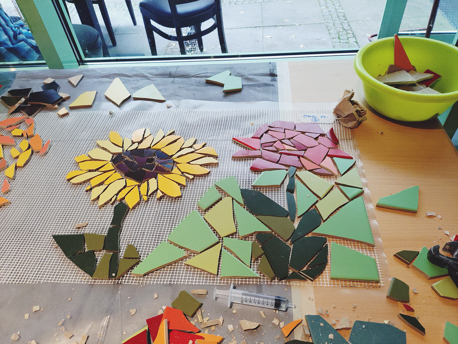 Im Rahmen der Jenfeld-Galerie startete im Juni ein öffentliches Mosaikprojekt mit Bürgerbeteiligung im Stadtteil Jenfeld. Gestaltet wurde ein 12 Meter langer Betonsockel am Haus. Für die einzelnen Stücke von jeweils. ca 3 x 0,6 m entstanden erstmal Ideen, die auf Papier skizziert wurden. Vielfalt und Frieden waren Begriffe, die genannt wurden, aber auch der Stadtteil an sich sollte dargestellt werden. Jenfeld hat seinen Namen vom "gelben Feld" (gelbe Erde). Den Stadtteil an sich prägen Hochhausbauten sowie Einfamilienhäuser und viel Grün. "Im Jenfeld gibt es ganz viele Raben", erzählte eine Teilnehmerin, eine Katze wünschte sich eine andere. Aus diesen "Bildern" galt es nun ein Gesamtkonzept zu erarbeiten.