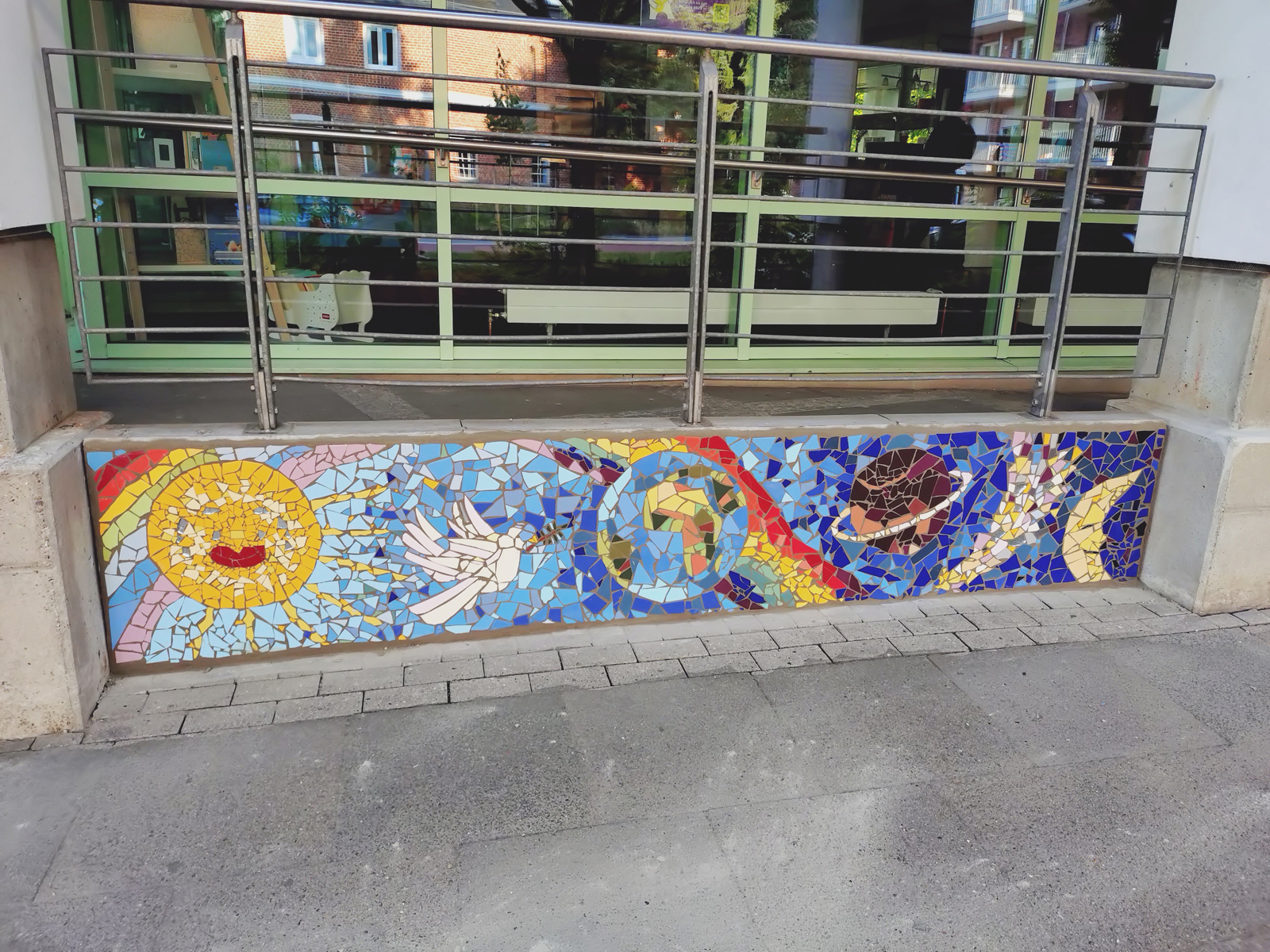 Die ersten beiden Stücke verbanden wir zu einer Geschichte: Der erste Teil zeigt Jenfeld, mit den typischen Häusern, mit Blumen, viel Grün, dem gelben Feld, einer Katze, einem Raben und einem Schmetterling. Aus dem Stadtteil fliegt eine Taube ins Universum (zweiter Teil) und verbreitet die Botschaft von Frieden und Vielfalt. Die Sonne gestaltete, in kindlicher Art mit einem Lächeln und Kussmund, eine Teilnehmerin nach ihren eigenen Vorstellungen. Dazu gesellte sich der lächelnde Mond, den eine 8 Jahre junge Teilnehmerin erarbeitete.